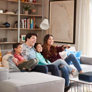 Cree y vea imágenes mucho más grandes que cualquier televisor con un proyector. Puede emitir una imagen de hasta 300″*. Perfecto para recrear la experiencia inmersiva del cine en la comodidad de su hogar.